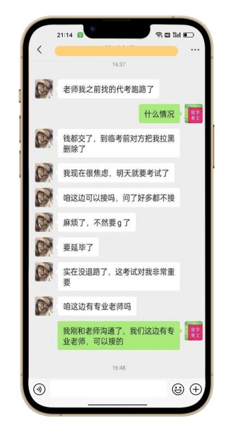 留学生小田在澳大利亚一所高校就读,因担心期末考试成绩,提前联系了一名代考人,并付清了双方商定的费用。按计划,双方应在考试前一天进行最后确认。然而,随着考试临近,代考人突然失联,不仅微信没有回复,还将小田拉黑。面对如此紧急的情况,小田四处寻找代考人无果,心急如焚,担心学业受到严重影响。