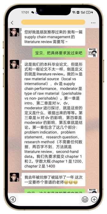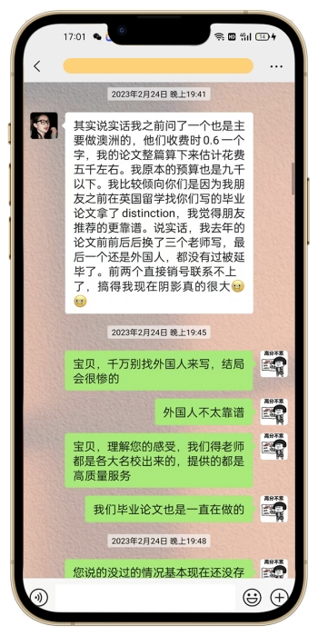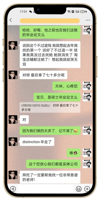 根据进一步详细沟通才得知,他之前被别人坑惨了。写毕业论文前前后后换了3个老师,最后一个老师还是英系本土老师,结果都挂了。不仅写挂这么糟心,他找的人提前说好不过退钱的,结果等分数出来,去找店家,店铺已经注销,微信也拉黑了,到处找不到人了,这个在他心里留下了深刻的阴影。