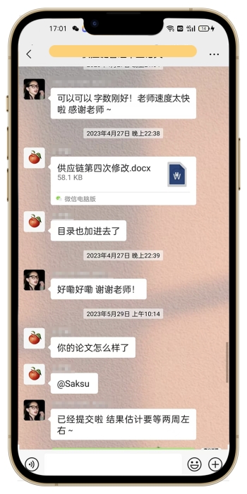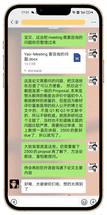 在中间长达3个月的服务中,我们都提前把和教授meeting的内容整理出来,包括需要回复教授的邮件都一一回应了。每次和教授meeting前,我们老师都会和他先语音讲下论文的主要内容,以及如果教授提问,我们应该怎么应对,电话打完,也会给个对应文档版的,这样能让同学知道论文写了什么,在和教授meeting的时候,不会慌乱,也能回答上问题,这样沟通才会顺利,也会加强教授的信任和好感。写完提交上去,我们也会根据教授的反馈不断修改。